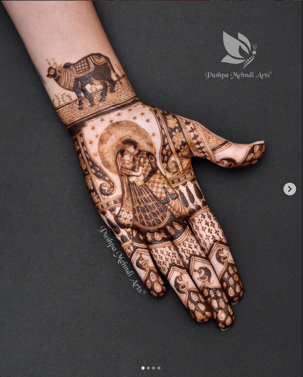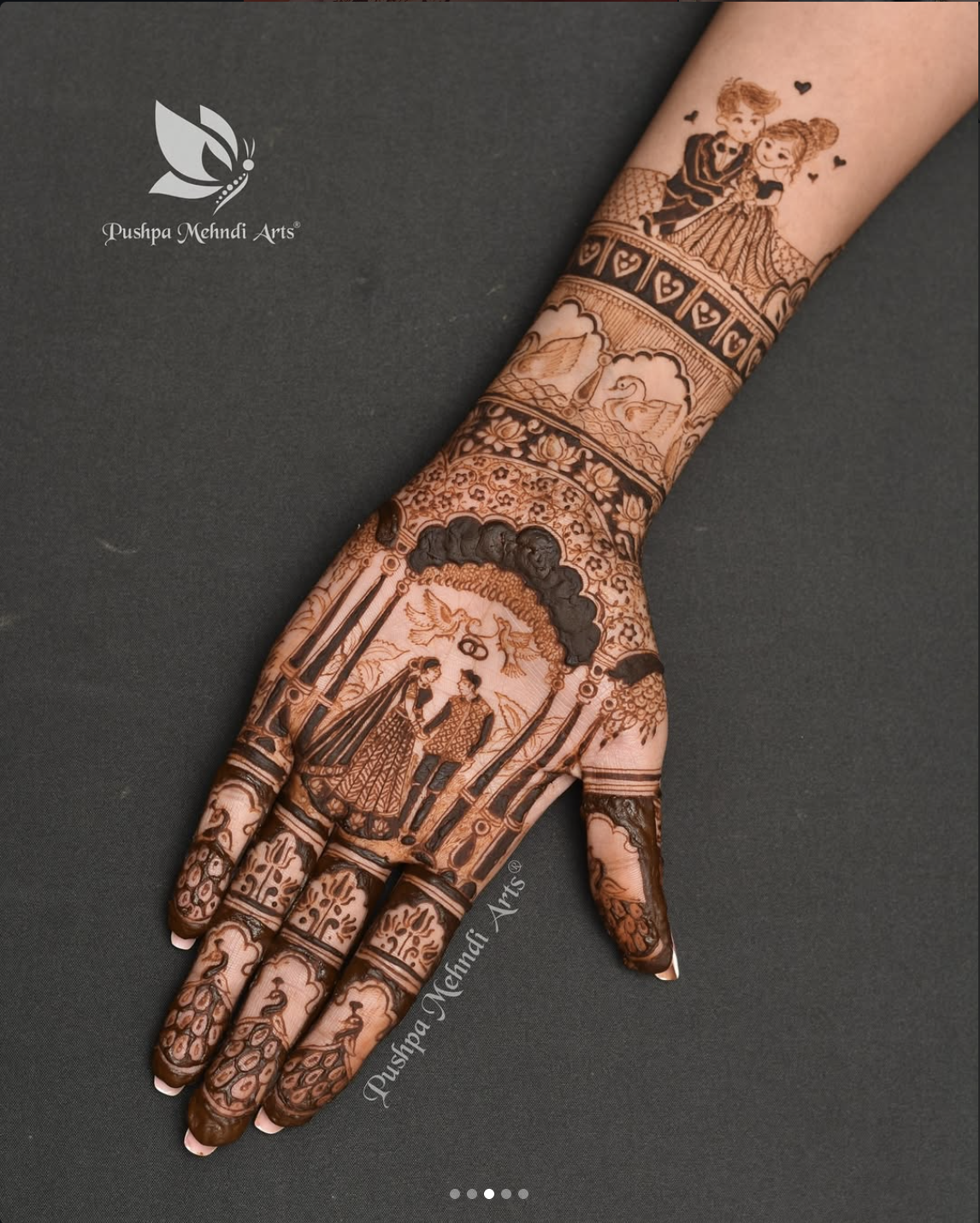 Elaborate bridal mehndi extending from fingertips to elbows, featuring the bride and groom motif, elephants, and wedding ceremony scenes.